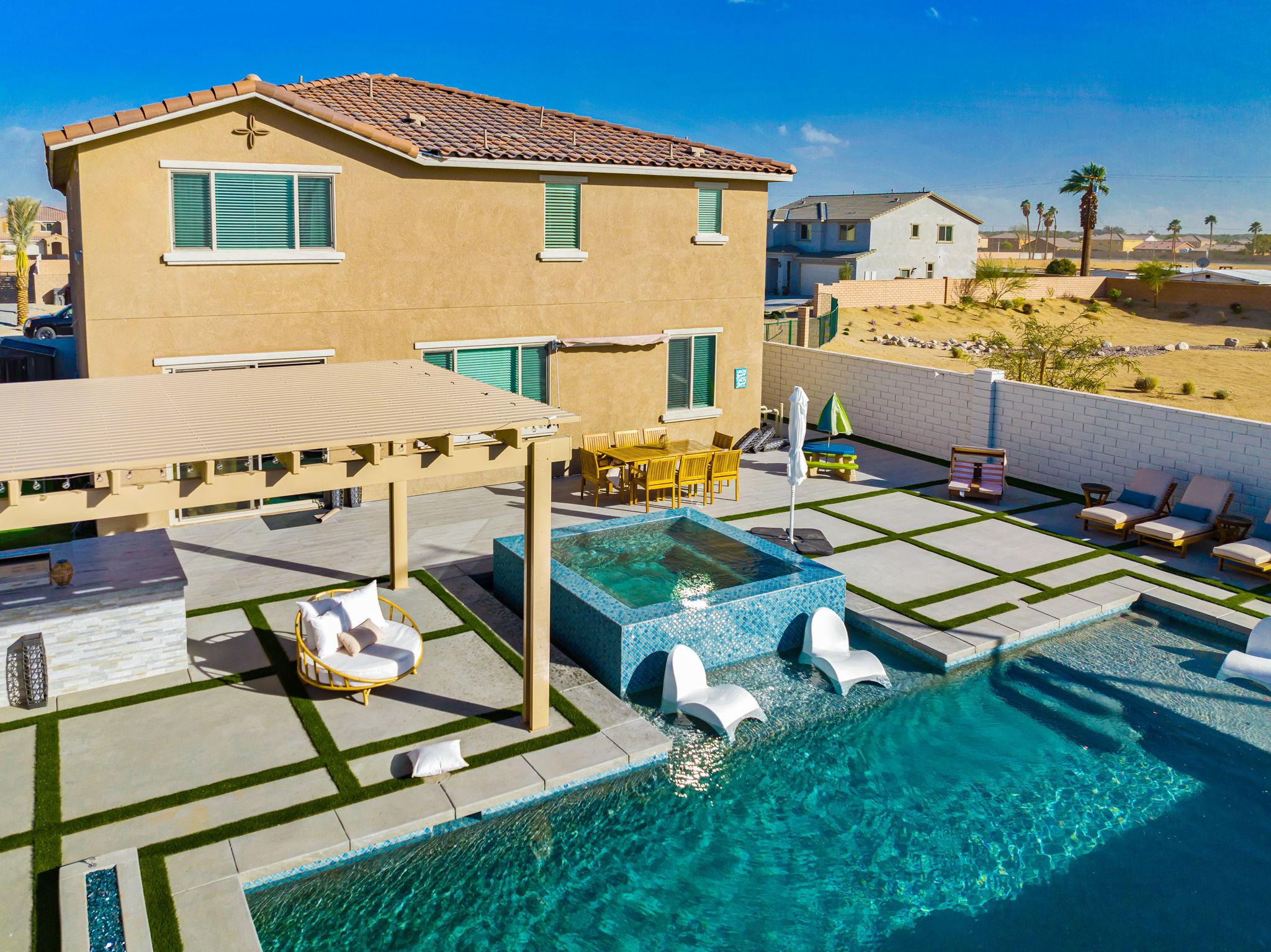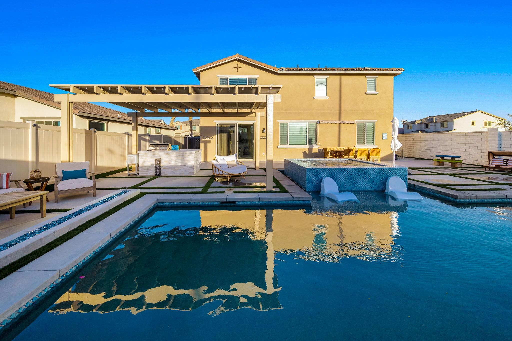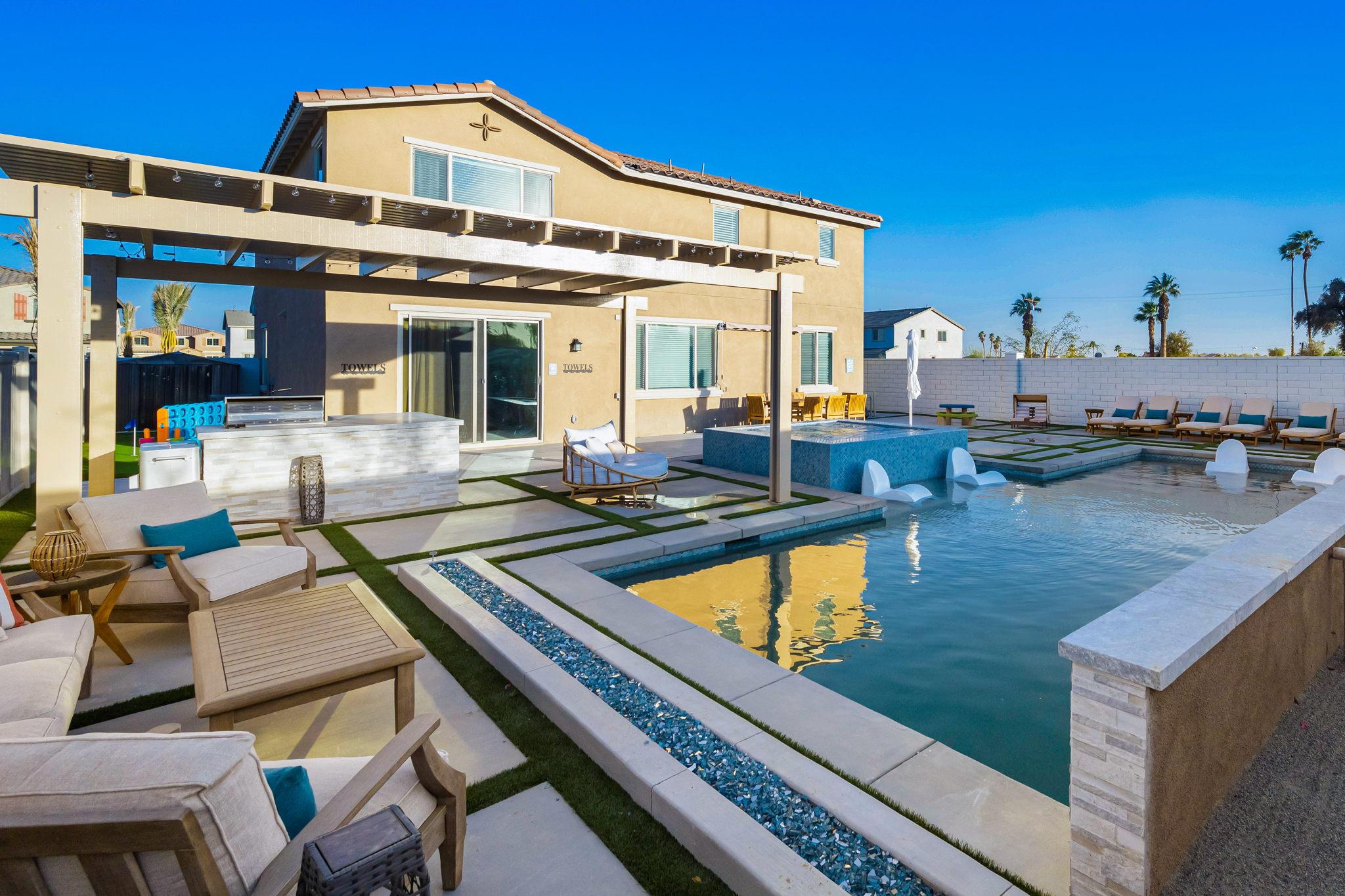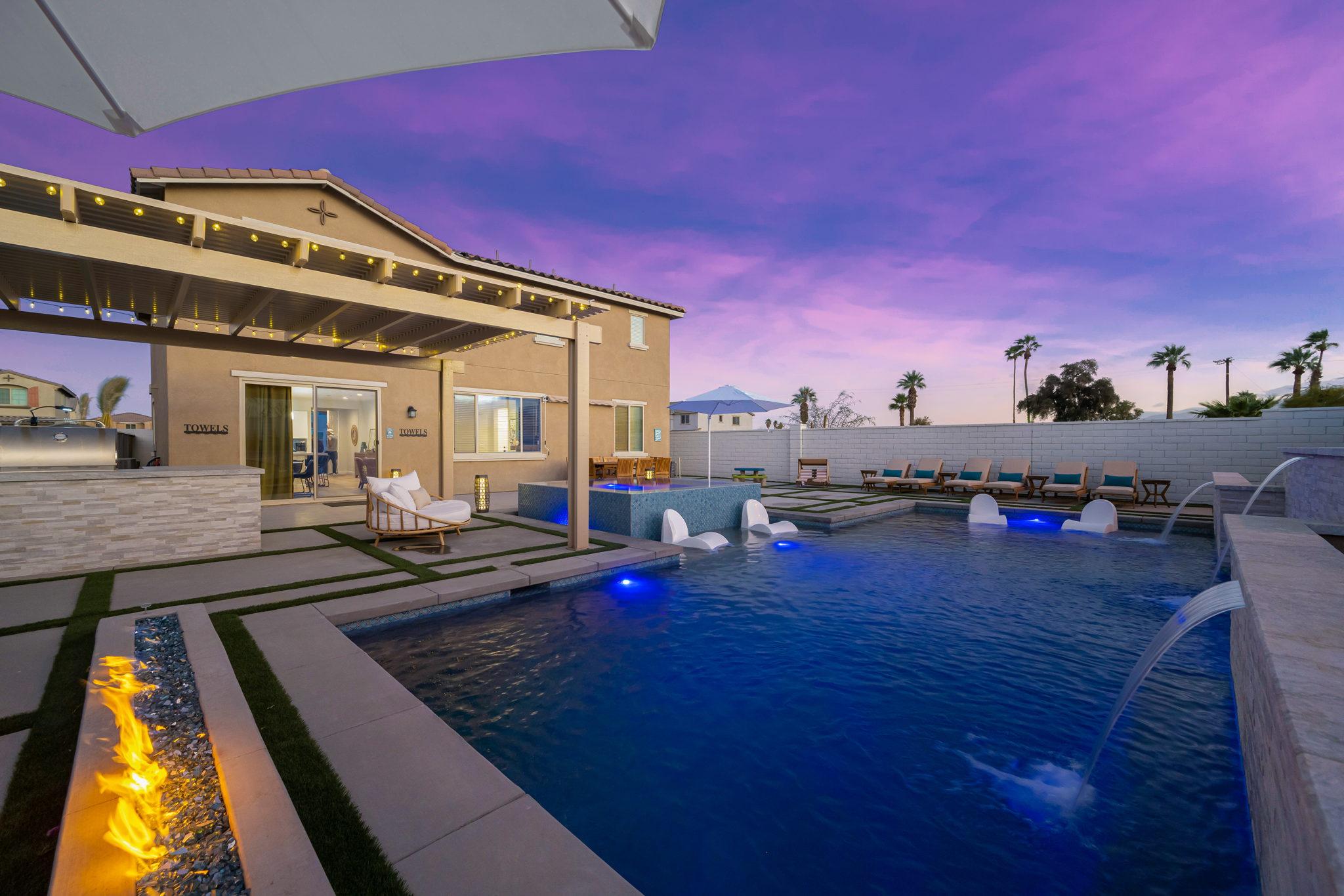 Indulge in luxury at this professionally designed vacation rental in Coachella. Presented by Luxliving Vacation Rentals, every detail of this stunning property has been meticulously planned for a 5-star private resort experience. Enjoy the extraordinary pool, spa, game room, fully equipped kitchen, and ultra-comfortable beds with smart TVs. Your tranquil oasis awaits in this best-of-the-best getaway!