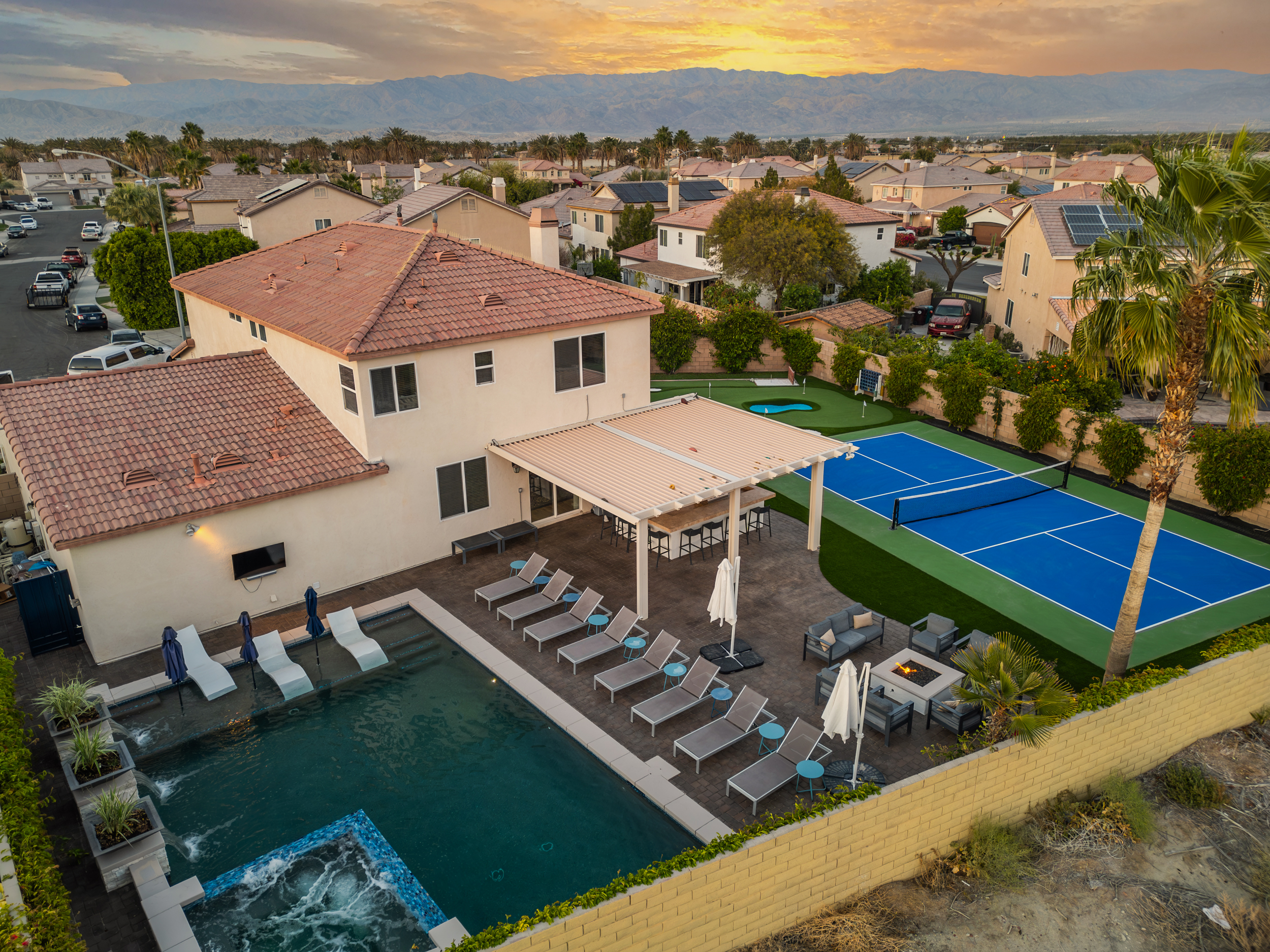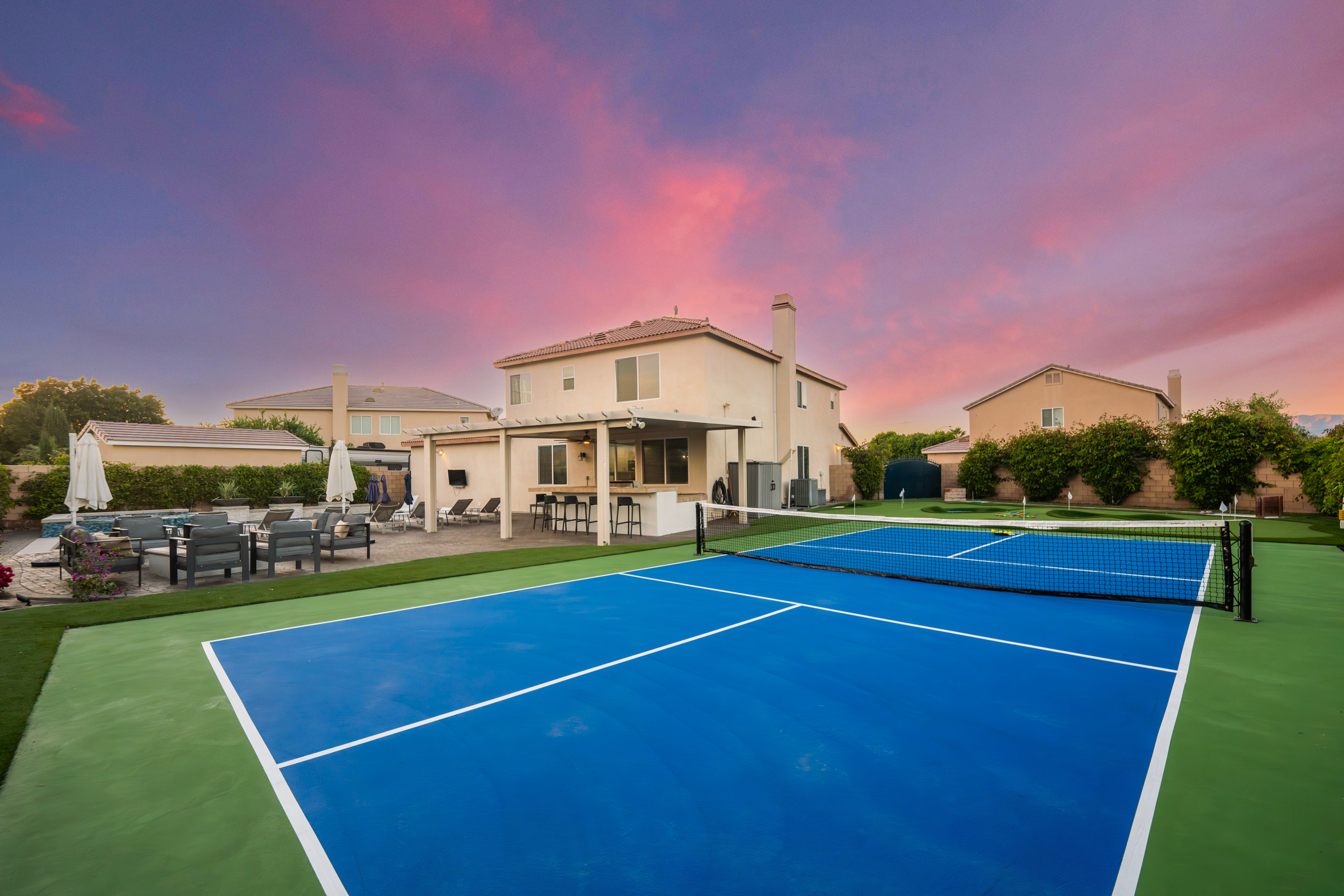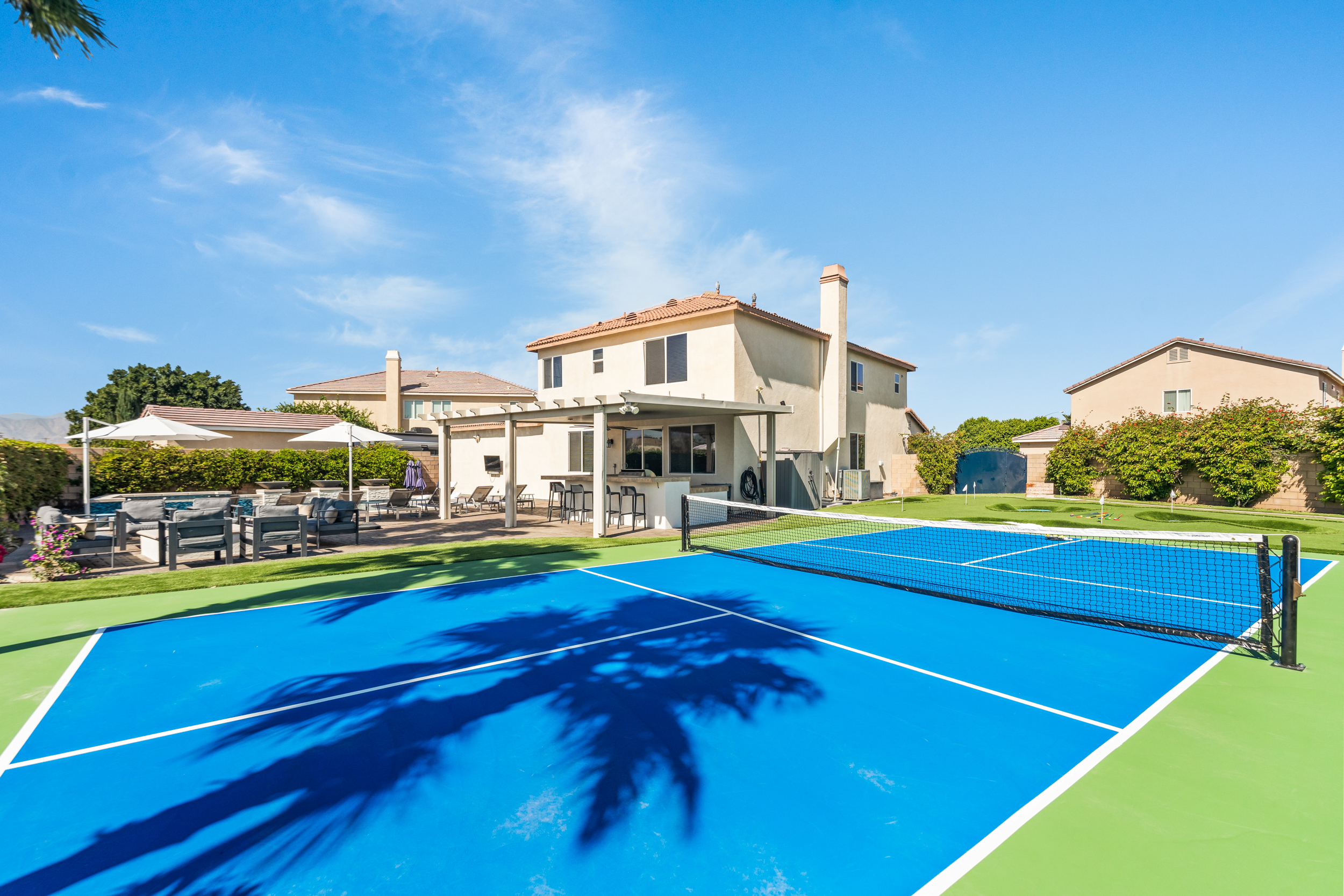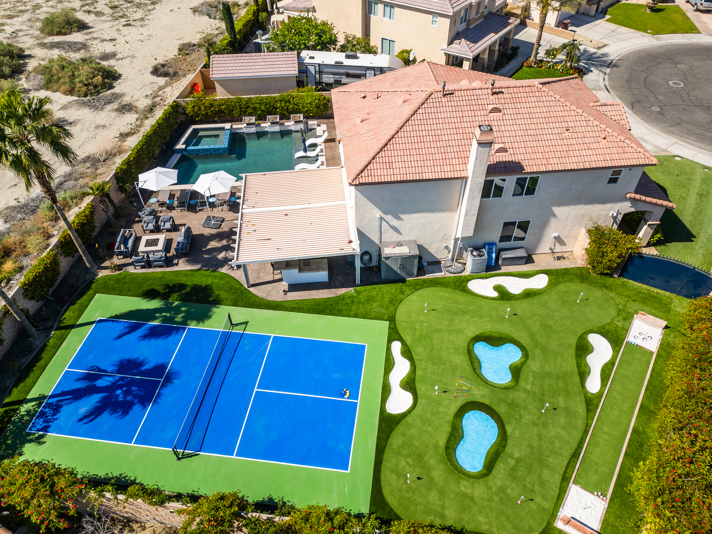 Fully revamped Coachella Dream property just added a full pickleball court!! Presented by Luxliving Vacation Rentals this 6-bedroom oasis offering resort-style living, complete with a remodeled interior. Lounge by the oversized pool, enjoy outdoor movies, or partake in activities with the brand new oversized putting green, boccie ball, and horse shoe. With festivals, golf, and polo nearby, entertainment abounds. Immerse in luxury with the Sonos sound system. Your ultimate desert escape awaits!