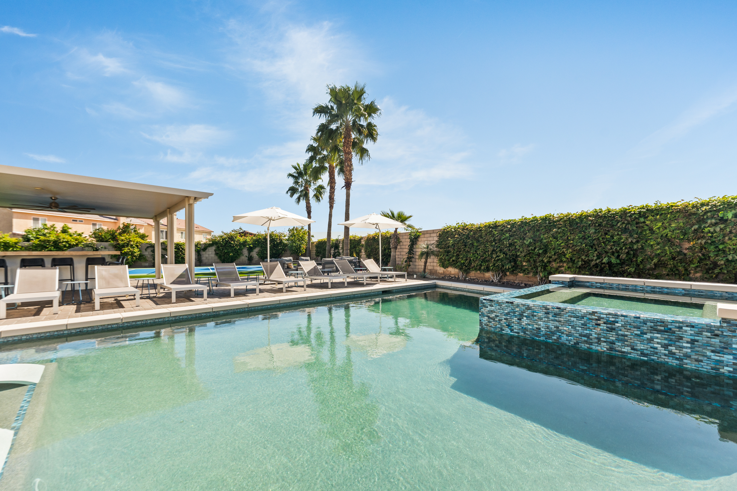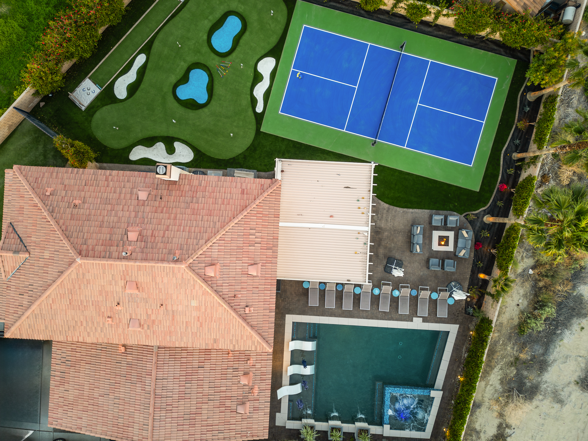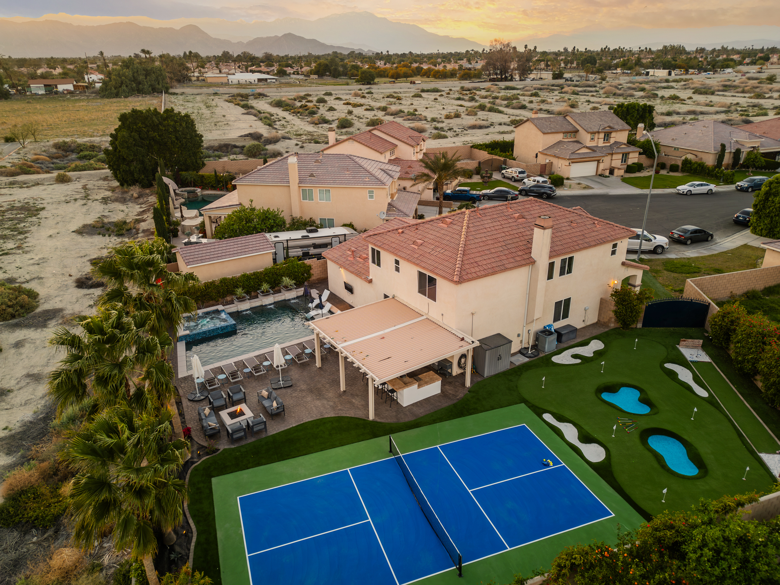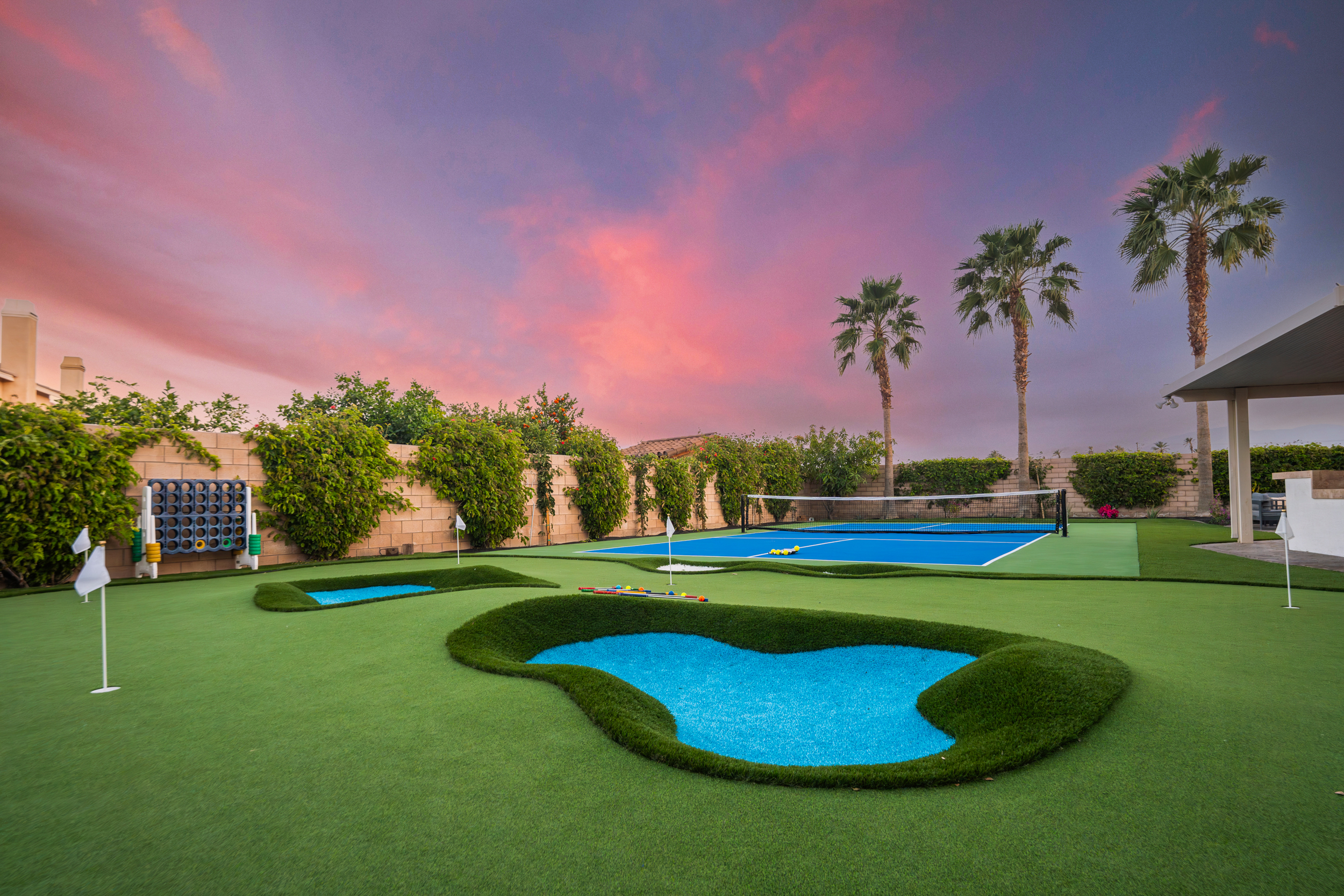 Fully revamped Coachella Dream property just added a full pickleball court!! Presented by Luxliving Vacation Rentals this 6-bedroom oasis offering resort-style living, complete with a remodeled interior. Lounge by the oversized pool, enjoy outdoor movies, or partake in activities with the brand new oversized putting green, boccie ball, and horse shoe. With festivals, golf, and polo nearby, entertainment abounds. Immerse in luxury with the Sonos sound system. Your ultimate desert escape awaits!