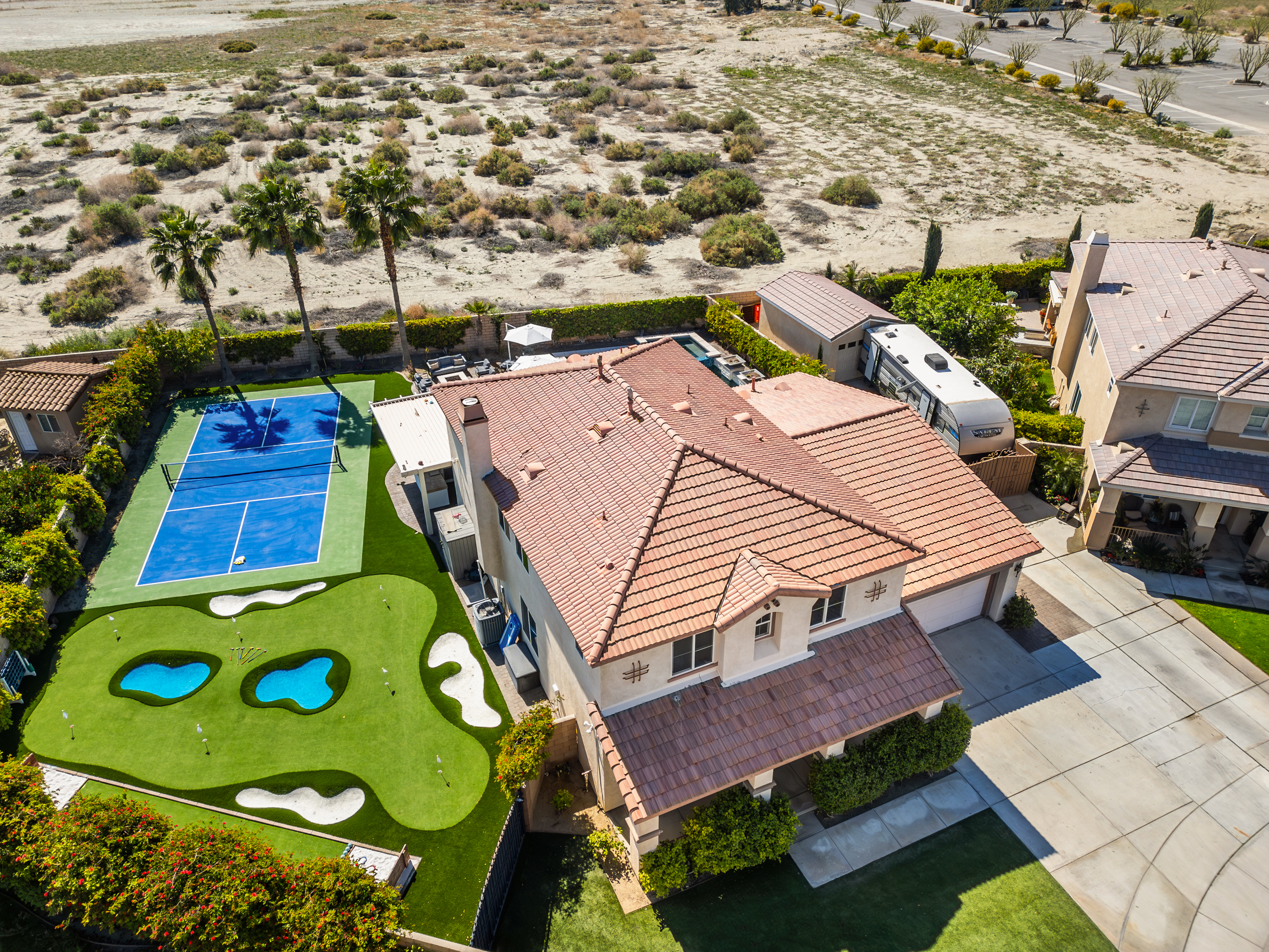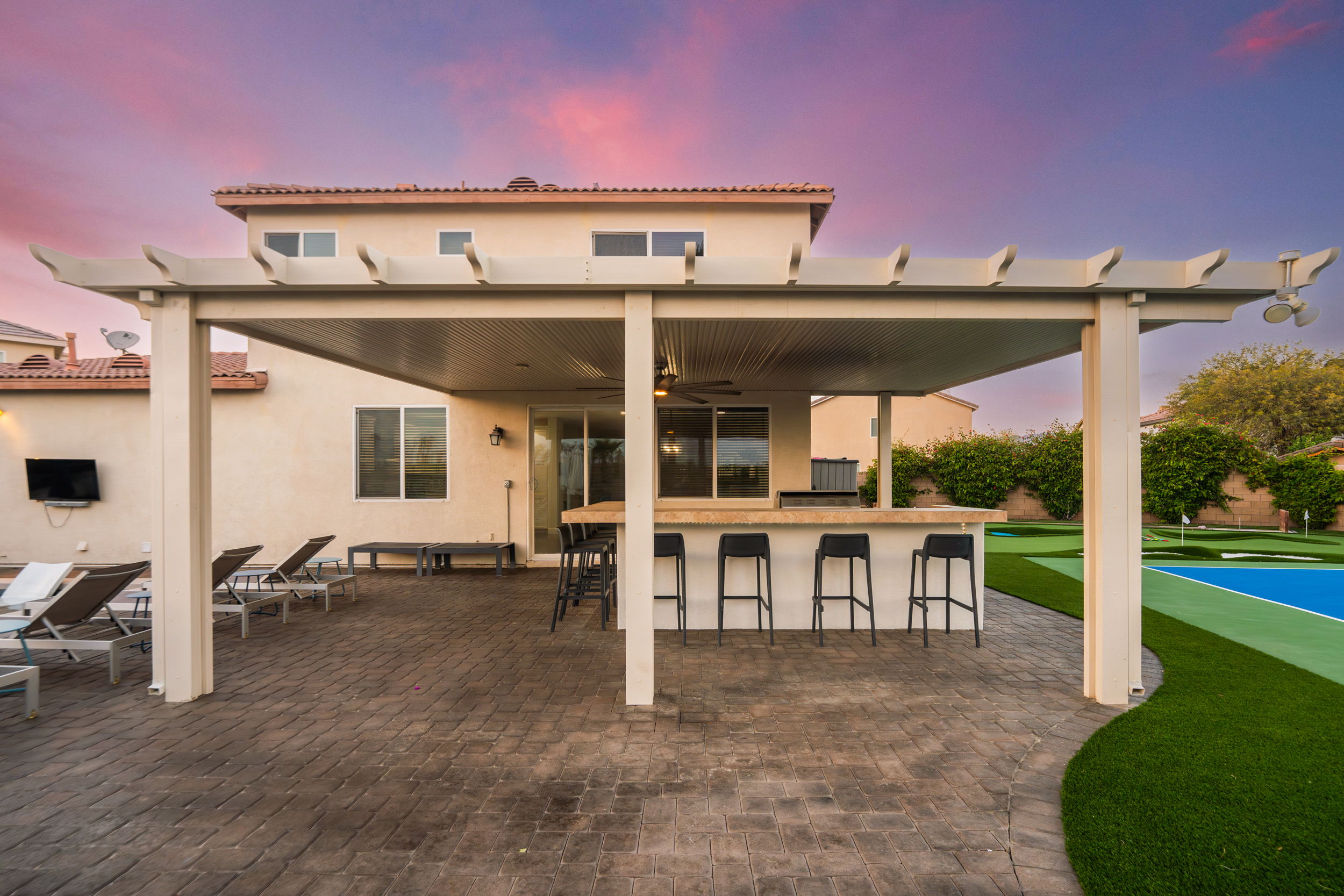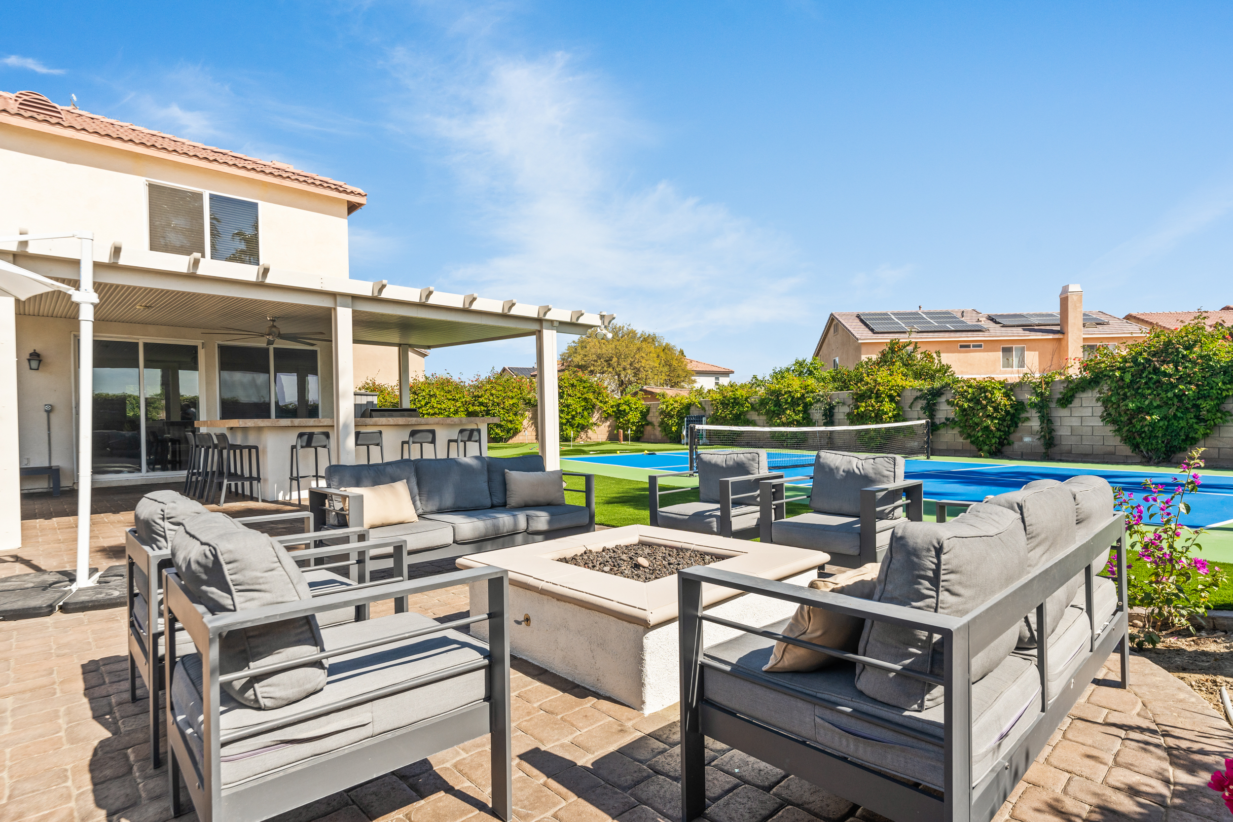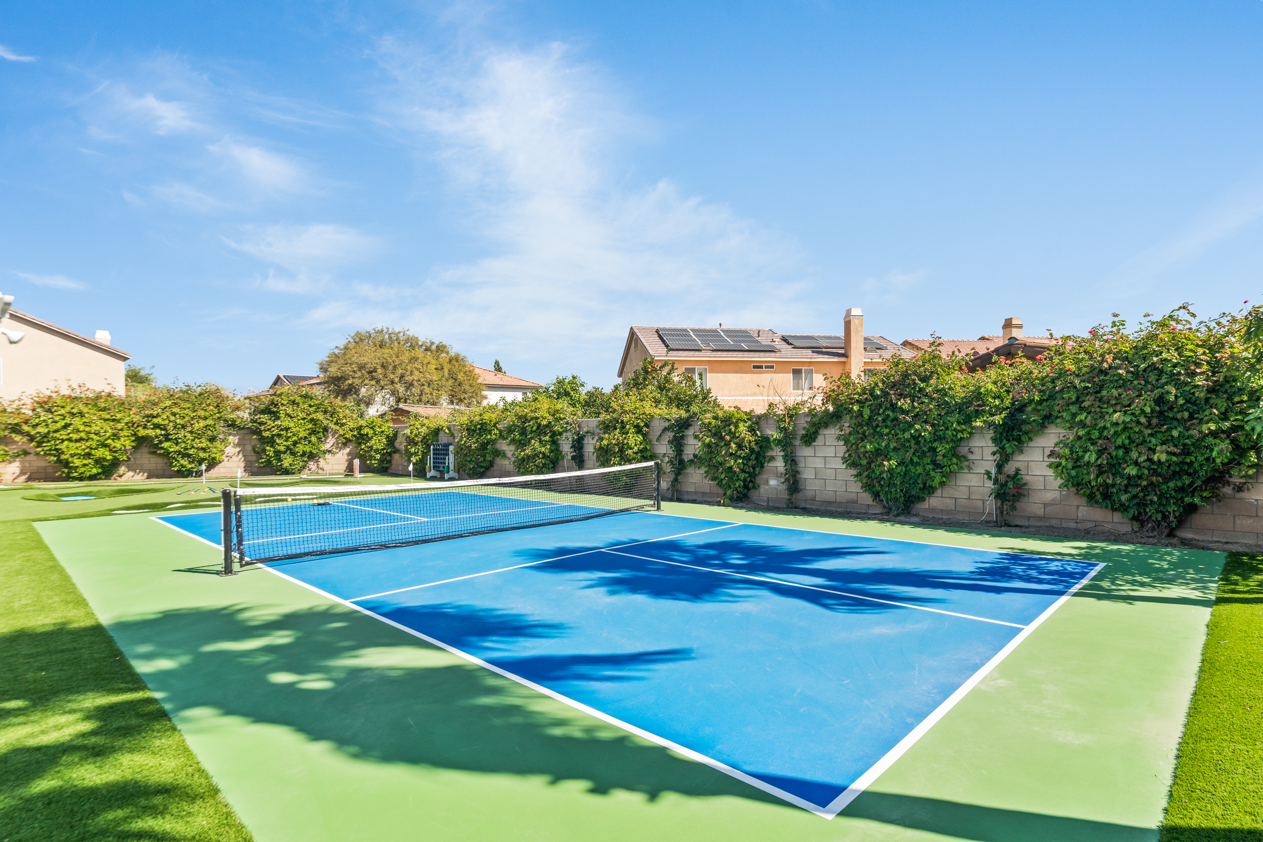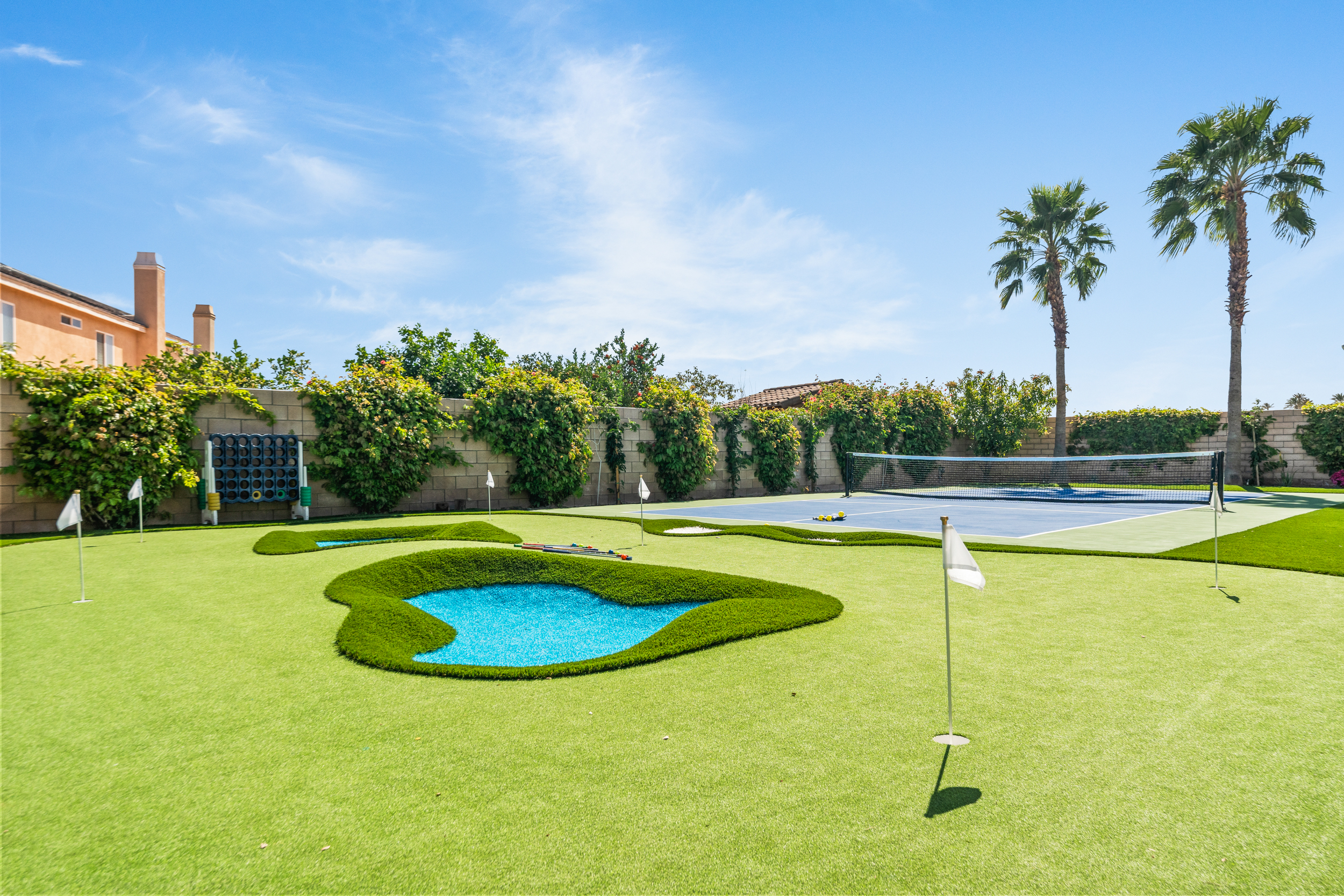 Fully revamped Coachella Dream property just added a full pickleball court!! Presented by Luxliving Vacation Rentals this 6-bedroom oasis offering resort-style living, complete with a remodeled interior. Lounge by the oversized pool, enjoy outdoor movies, or partake in activities with the brand new oversized putting green, boccie ball, and horse shoe. With festivals, golf, and polo nearby, entertainment abounds. Immerse in luxury with the Sonos sound system. Your ultimate desert escape awaits!