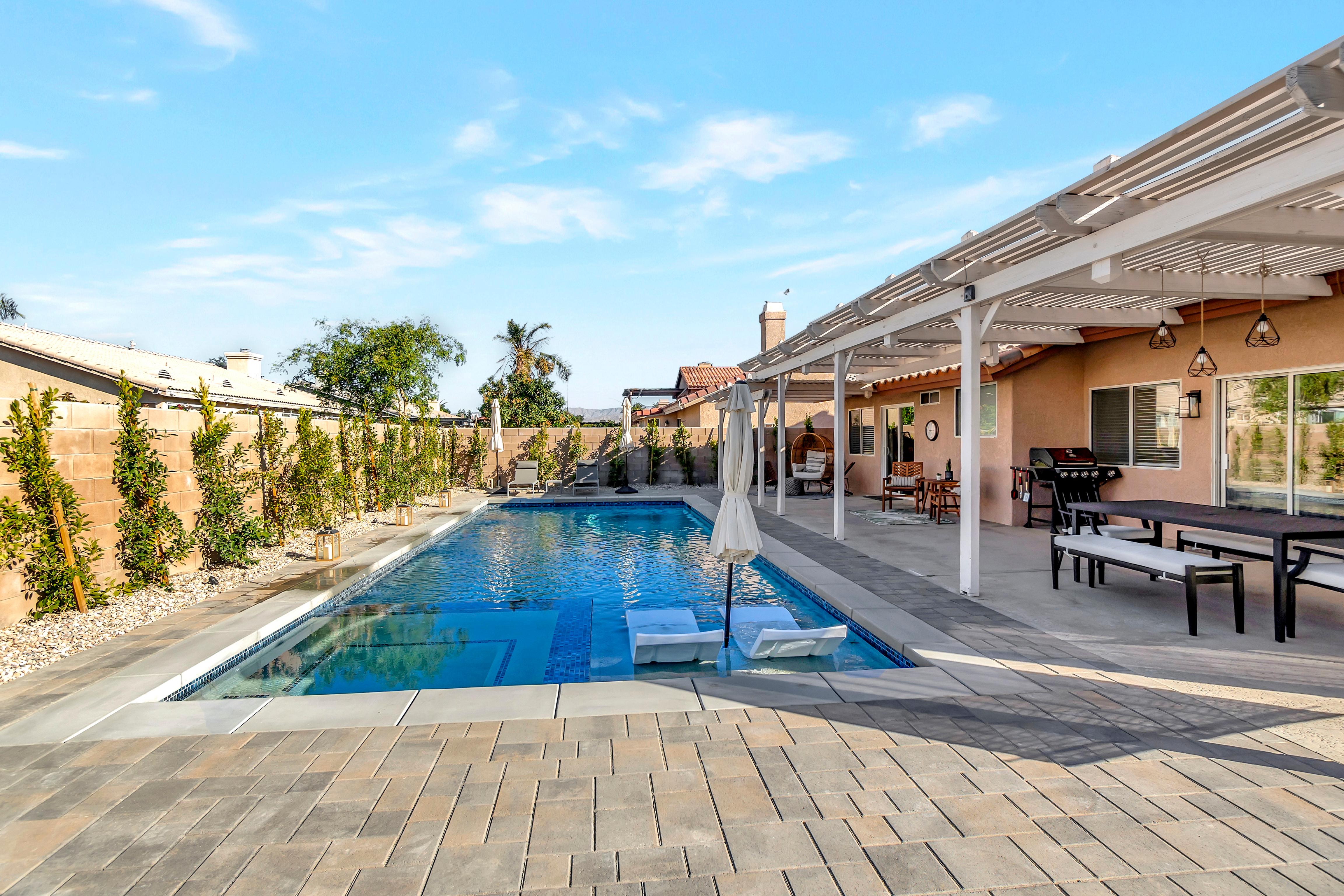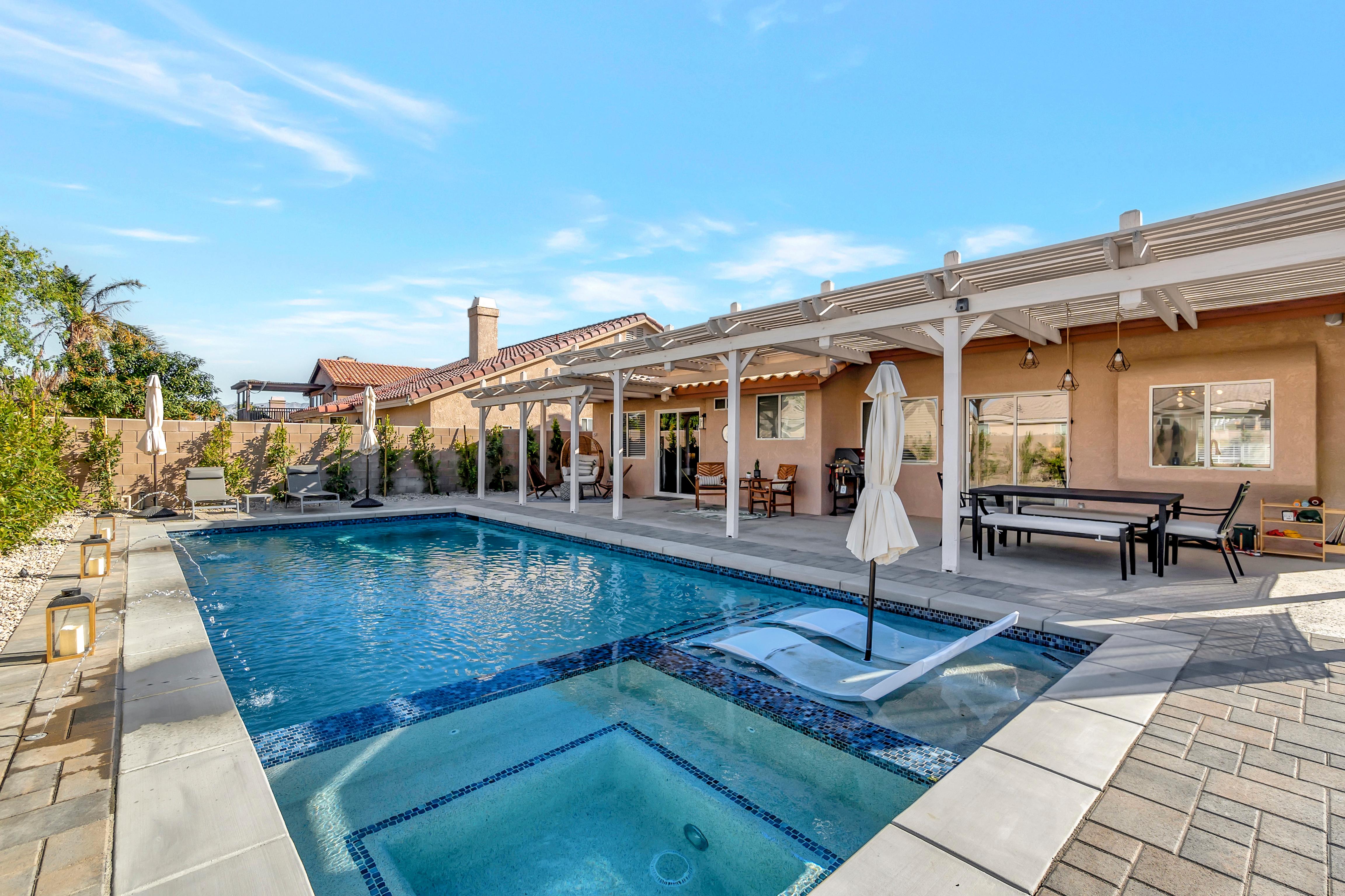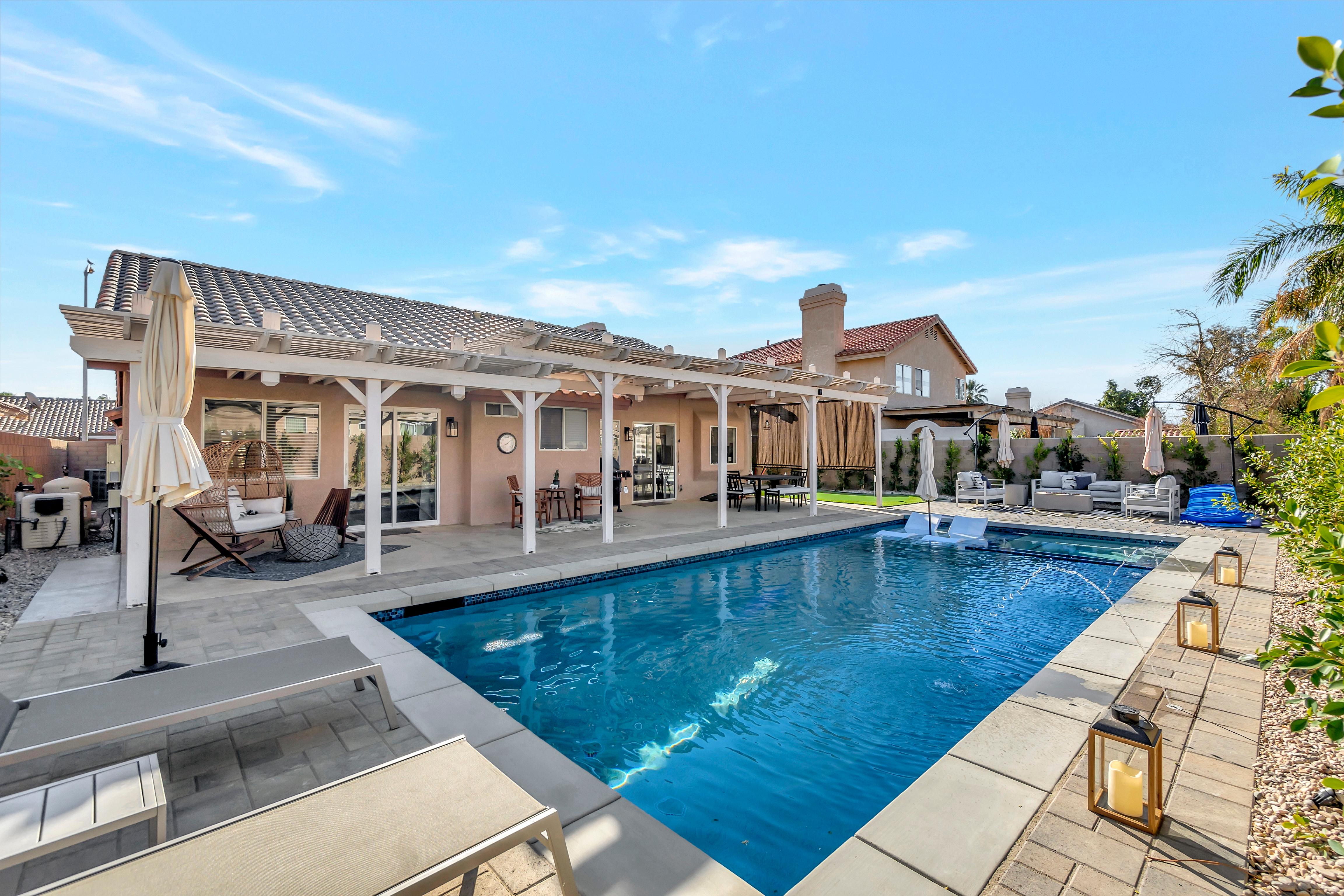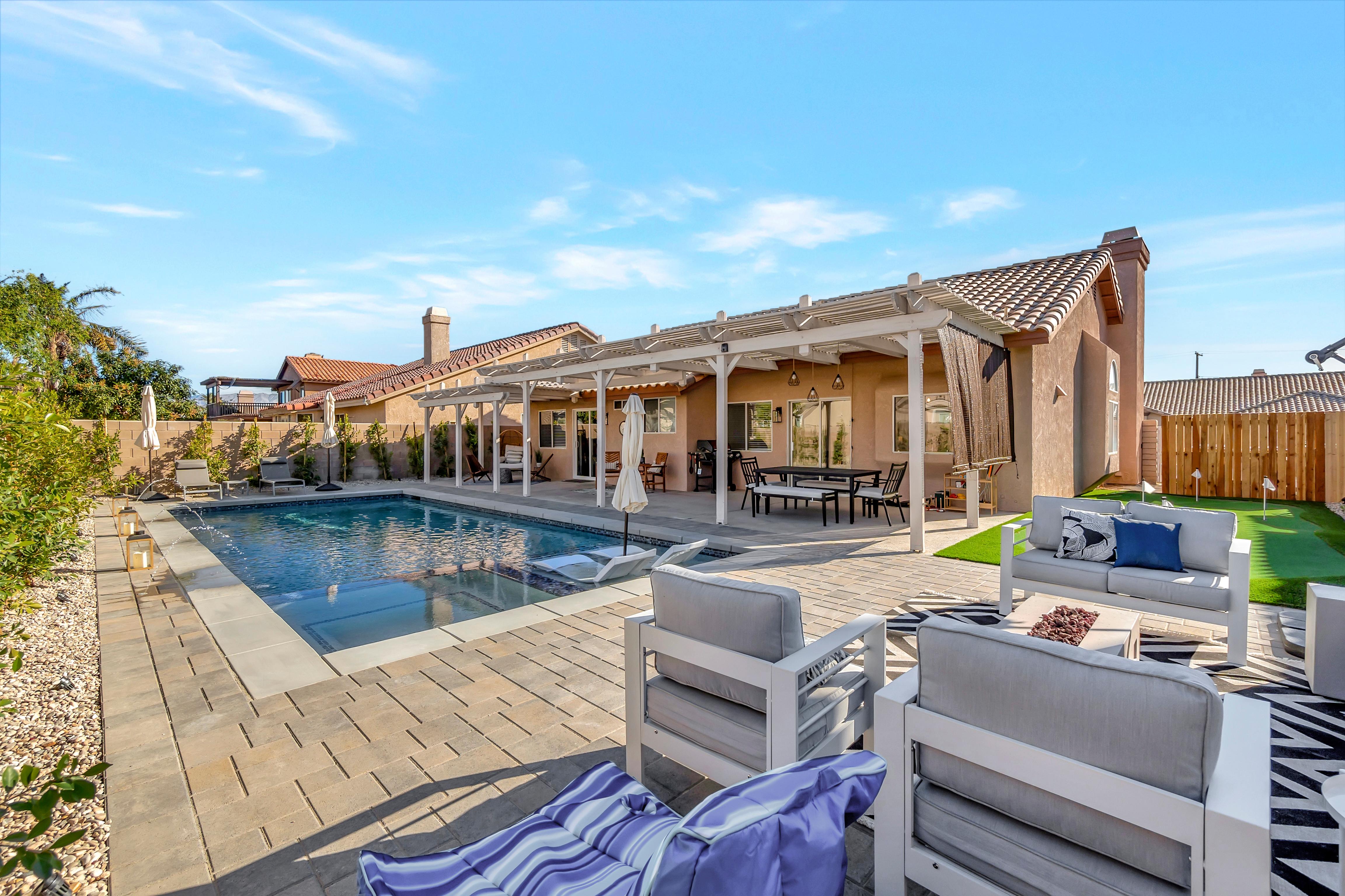 LuxLiving Vacation Rentals presents "The Desert Escape" - A Newly remodeled desert masterpiece! Come relax at this beautifully designed home. Spend the afternoons floating in the pool, or soaking up the sun in one of the many outdoor lounge areas. Enjoy the warm evenings grilling outdoors or cooking in the fully stocked kitchen. This home was designed and decorated with one thing in mind...ultimate relaxation and no detail was overlooked.