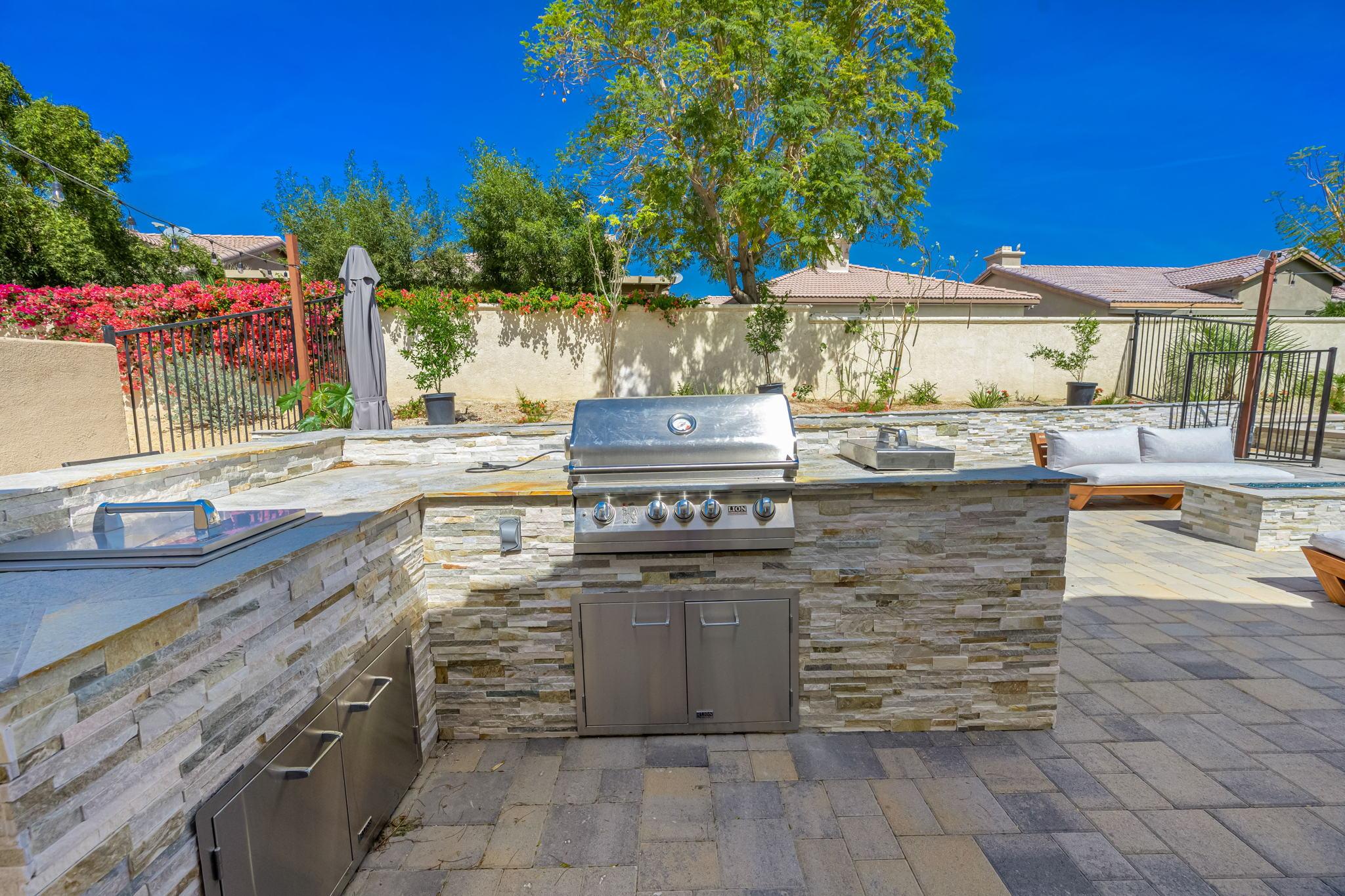 tanning shelf with loungers. The adjacent home features an outdoor BBQ grill, stove and ice bin and