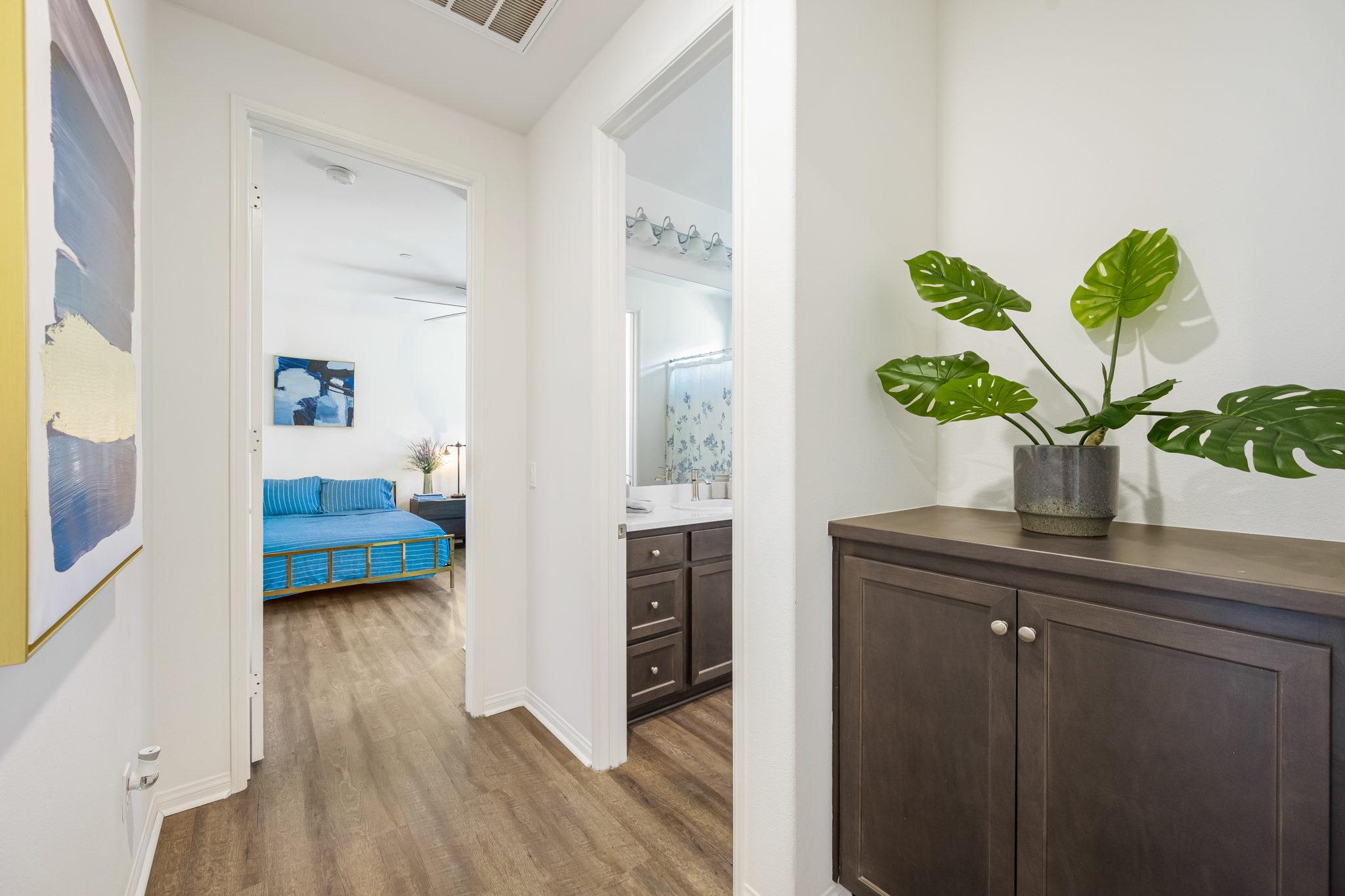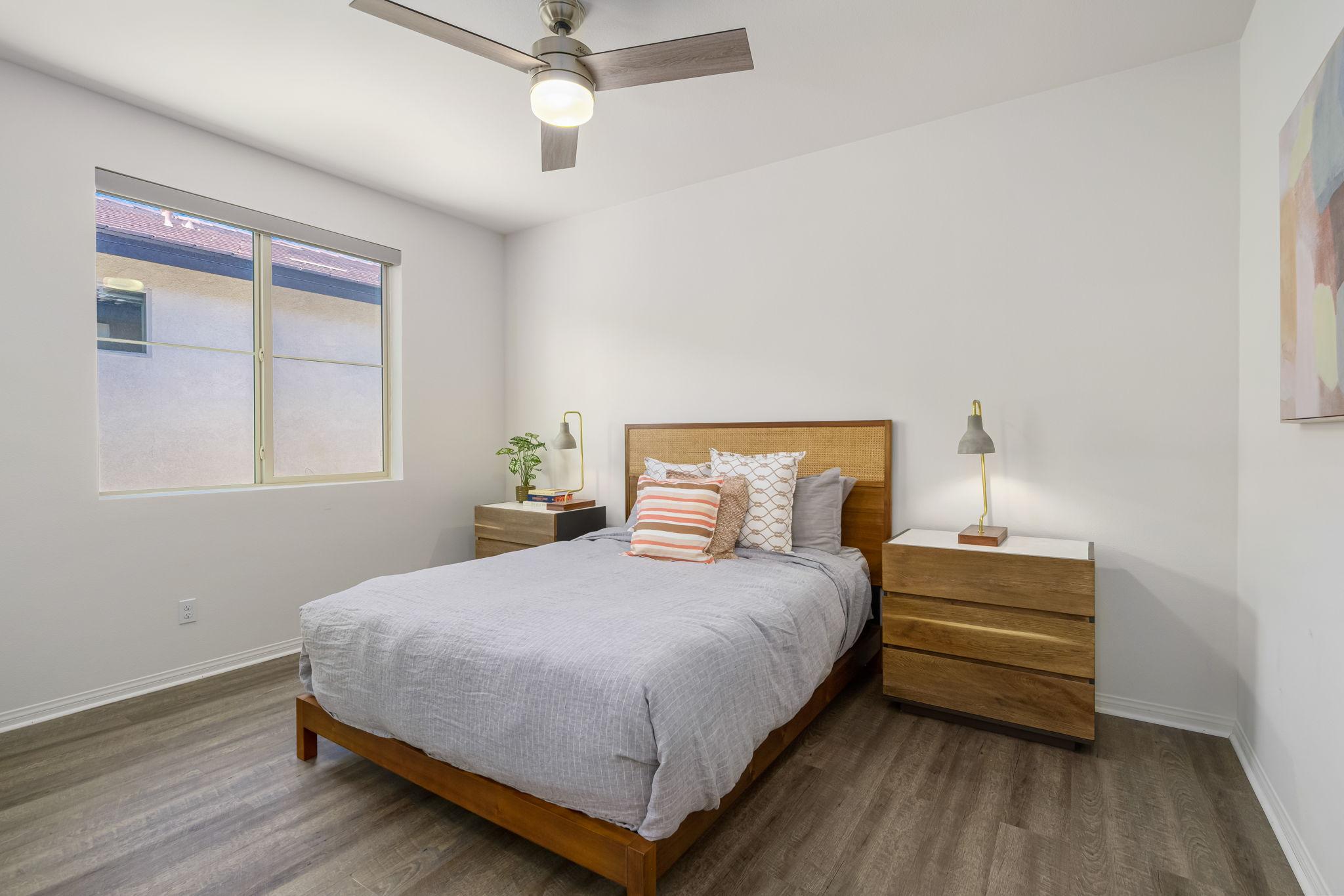 bedrooms, each with their own flair, are both spacious and bright, and share a bathroom.
