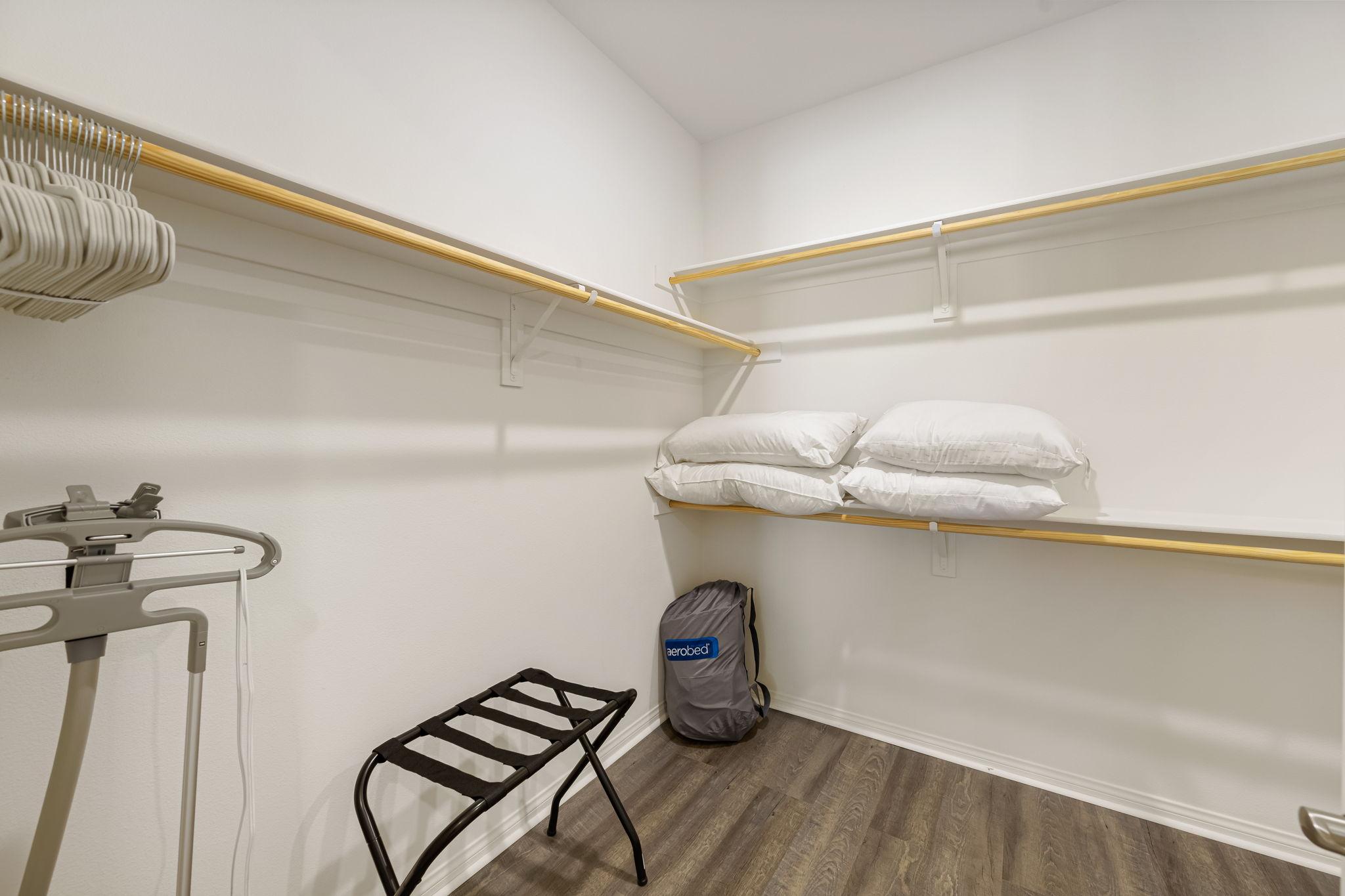 There are bath towels, pool towels and bed linens. We provide an initial supply of trash liners, toilet